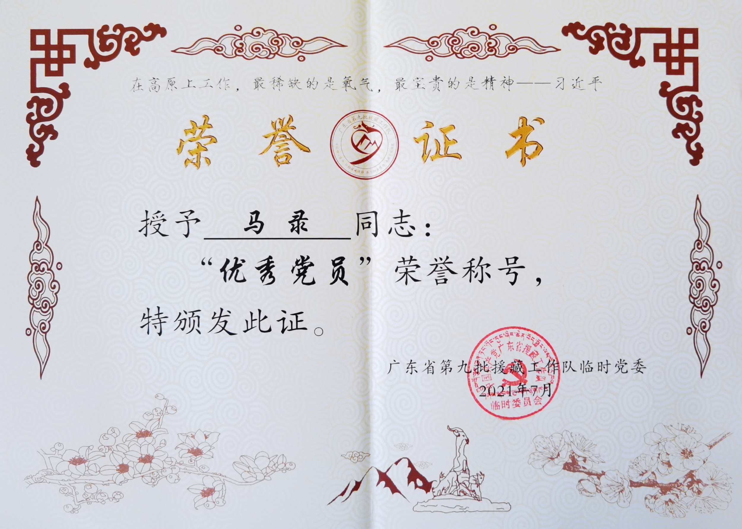援藏期間,馬錄同誌用堅(jiān)韌植根雪域高原、用智慧演繹精彩人生(shēng)、用實績書寫援藏情懷,展現(xiàn)了新時代援藏幹部人才新風采,奏響了新時代幹部人才援藏工作(zuò)新凱歌,在真情奉獻中樹立了標杆榜樣,贏(yíng)得了林芝(zhī)市人民高度讚譽,先後榮獲“林芝市五一勞動獎(jiǎng)章”、“優秀援(yuán)藏幹部人(rén)才”、“優秀黨員”等榮譽稱號。馬錄同(tóng)誌無愧為廣東人民的好兒女,無(wú)愧(kuì)為城投(tóu)集團的優秀幹部,樹立了城投人的良好(hǎo)形象,為城投(tóu)集(jí)團贏(yíng)得了榮耀。大學(xué)城公司為你感到驕傲。