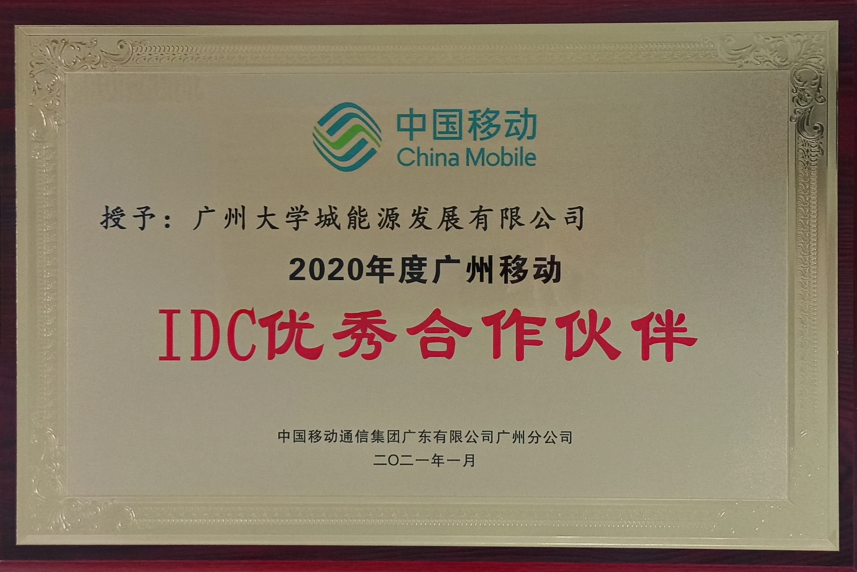 廣州榴莲视频下载官网入口能源發展有限公司(以下簡稱(chēng)“能源公司”)喜獲廣州移動“2020年(nián)度廣州移動IDC優秀合作夥伴(bàn)”榮譽稱號。