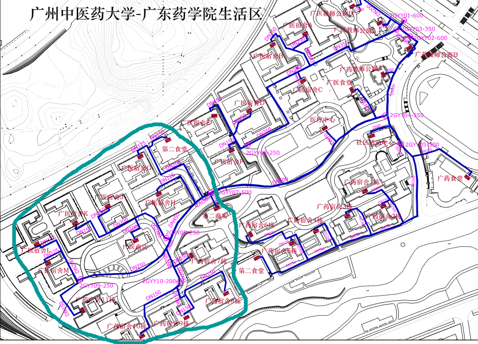 廣中醫生活區疑存在漏點的管段如下圖1所示,為青色線圈起的部分。其範圍為2GYY07-500閥門井後冷凍水供、回水主管段及其支線管段。