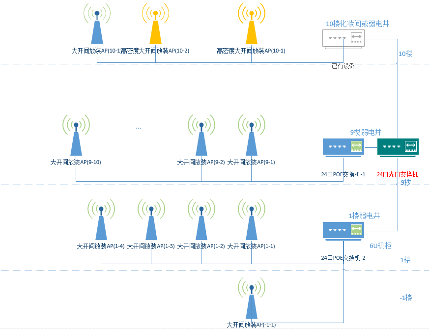 | 區域 | 位置 | 大開(kāi)間放裝AP | 高密度大開間放裝AP | 24口POE交換機(帶(dài)光口(kǒu)) | 24口光纖交換機(jī) | 6U掛壁機櫃 |