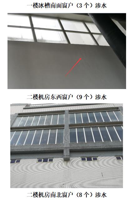 2#、3#、4#冷站外牆、屋(wū)麵滲漏情況簡要如下:2#冷站二(èr)層、三(sān)層東麵外牆多處窗戶滲水(共11處);3#冷站一、二層(céng)外牆窗戶滲水(共(gòng)30處),更衣室天麵、控製室(shì)與洗手間之間(jiān)天麵滲水(共2處),熱水班休(xiū)息室、4號-7號風櫃房外牆窗(chuāng)戶滲水(共12處);4#冷站南北側(cè)二、三層樓梯(tī)間窗戶和西側三、四層走廊窗戶、門,4號、6號(hào)主機天麵排風口、1#冰槽南牆體滲水,南北冷卻水管井滲水(共17處),現對上述滲水部位采(cǎi)取補漏措施。