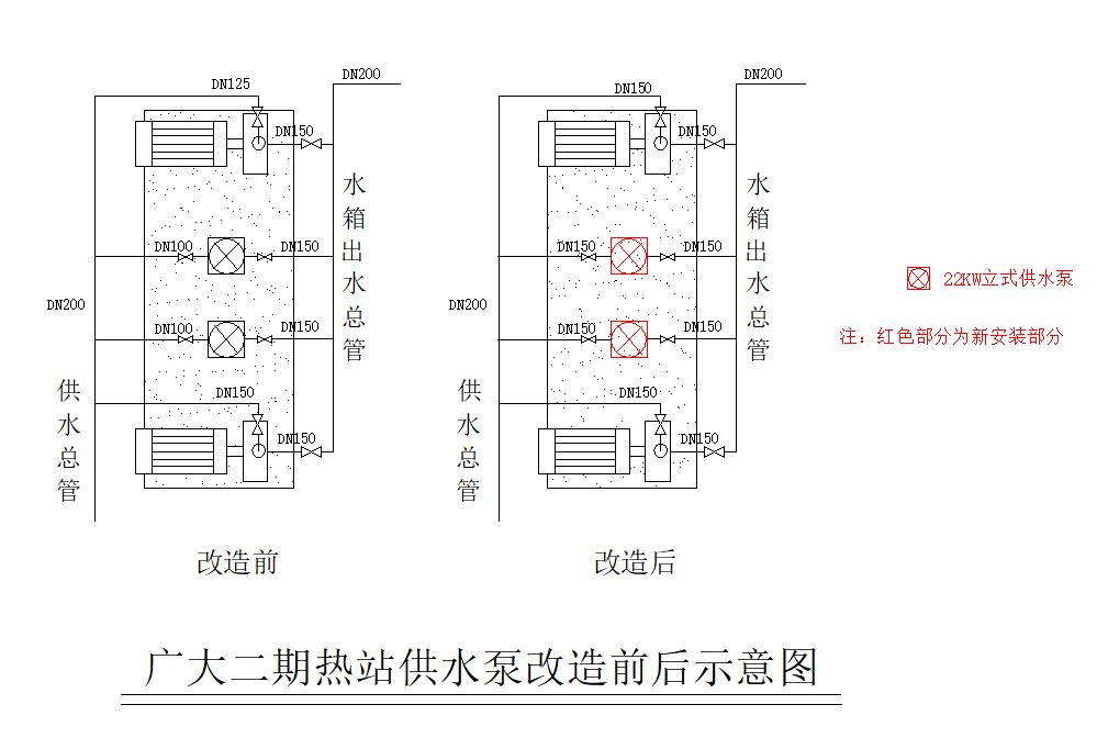 2、在拆除原泵的位置上安裝2台全新的22 KW立式供水泵,進出水管道係統沿用(yòng)原管道(dào)係統。