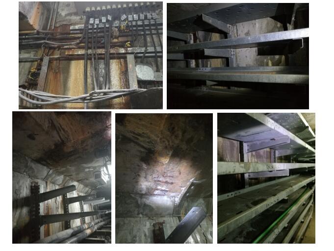 處(chù)理方(fāng)案:不影響(xiǎng)管溝(gōu)線管正常工作的情況下,將影響補漏施工區域現有支架拆下;表(biǎo)麵(miàn)清理(含外露鋼筋除(chú)鏽(xiù)+環氧樹脂防腐);根據裂縫走向鑿槽,高滲透性改性環氧樹脂灌(guàn)漿(jiāng);堵漏(lòu)靈封堵;塗刷滲透型(xíng)水(shuǐ)泥基結晶防水塗料;恢(huī)複原有的支架。