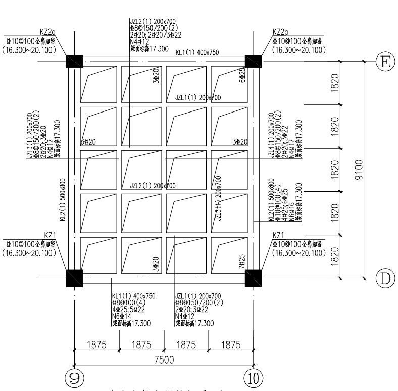 消防補水箱網(wǎng)格梁設備基礎:位置夾層軸線9-11/E-D之間(見圖(tú)一),單跨(kuà)尺寸麵積為:9.1m*7.5m,兩跨尺寸麵積9.1m*15m9-10/E-D軸(zhóu)與10-11/E-D軸內結構標高(17.3m)、尺寸、配筋一致,混(hún)凝(níng)土標號(hào)均為C30,具體等見圖二(èr)。現場三層樓麵建(jiàn)築標高約16.5m,極限承載力約4kN/㎡,其中9-10/E-D軸已經預埋鋼筋(須調直+補充遺漏),10-11/E-D軸需(xū)全部植筋。