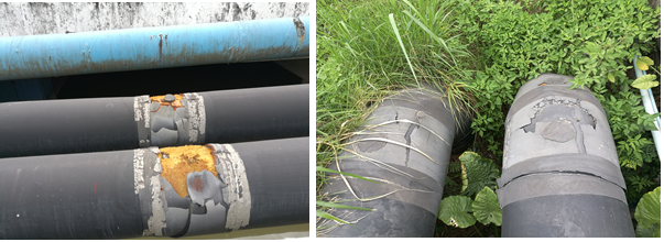 6) 冷凍水(shuǐ)管縱向裂紋處保溫層裂紋部分清理、露出鋼管部位除鏽防腐,HDPE保護層恢複原樣;伸縮節(jiē)、彎頭處裂紋保護層清(qīng)理,露出保溫層。